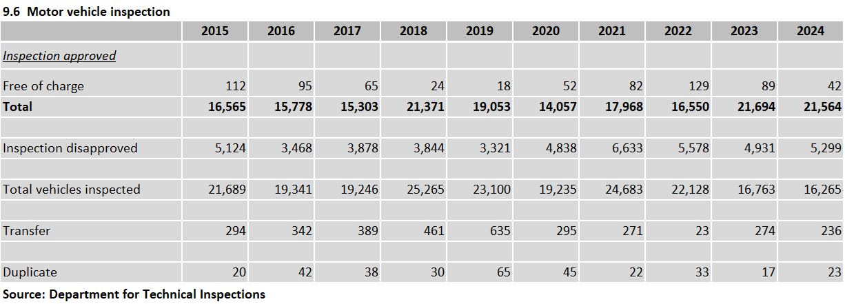 • Table 9.6 Motor vehicle-inspection, 2015-2024 - - (11 kB)