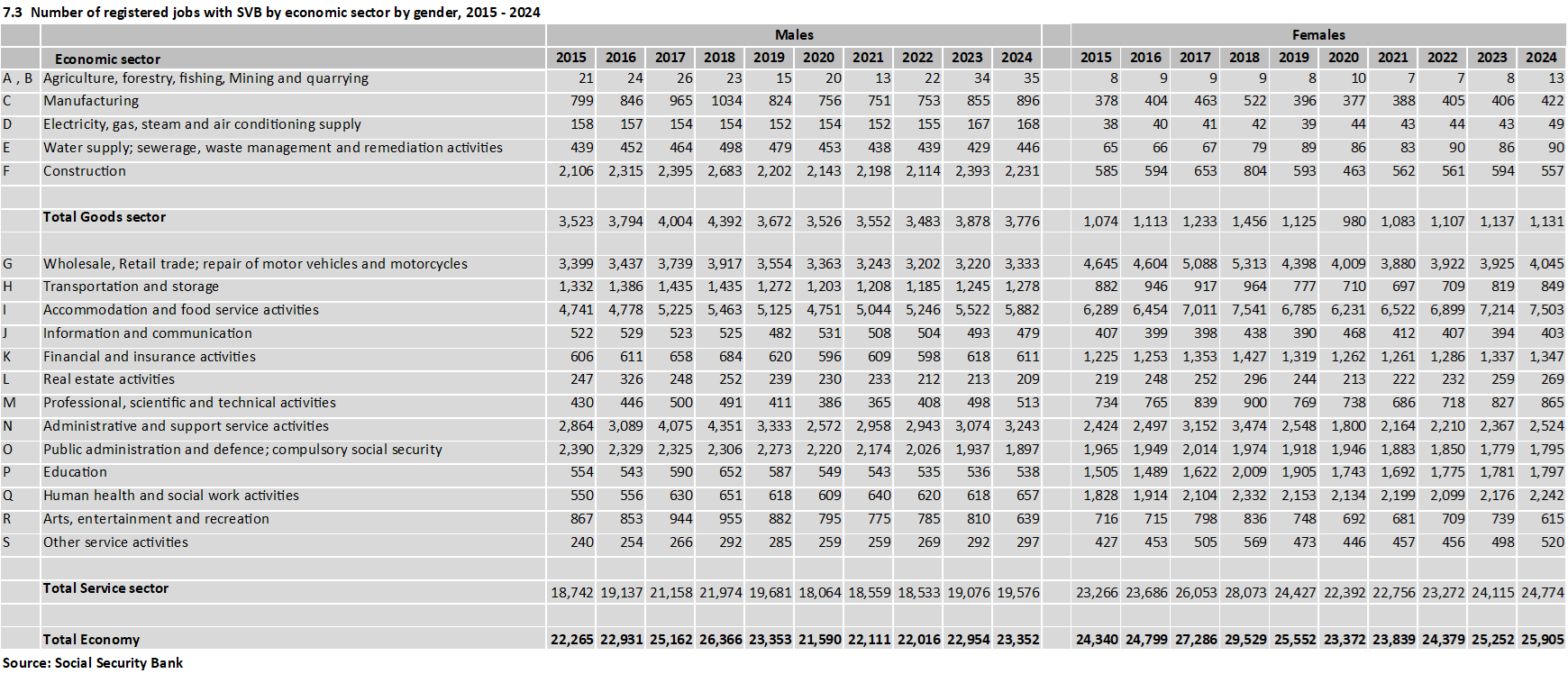 Download items: Table 7.3 Number of registered jobs with SVB by economic sector by gender, 2015-2024 - - (15 kB) 2020-06-11