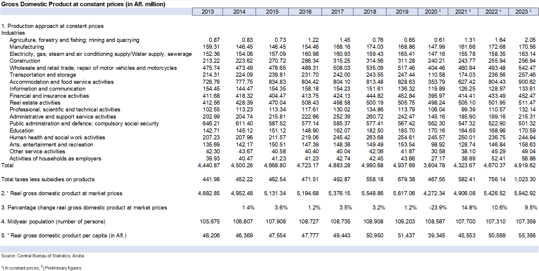 This table reflects the GDP Approach at constant prices for Aruba for the years 2013 up to 2023. Download items: GDP Production Approach at constant prices 2013-2023_rev - - (18 kB) 2026-02-18